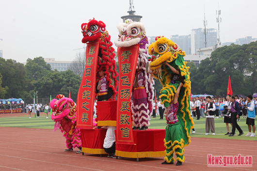 南狮表演拉开了开幕式的序幕,表达了对运动健儿大展风采的美好祝愿。啦啦操表演活力四射的舞姿,展现出西大学子积极向上的精神风貌,空中一字、前后空翻、高空托举等高难度动作更是瞬间点燃现场气氛。在升旗仪式环节,学子们高唱国歌,以饱满的热情表达浓厚的爱国 本届校运会采取竞技比赛与竞游比赛相结合,竞争性与趣味性并存。分为学生组和教工组,学生组有100米跑、跳高等13项田径比赛,哑铃跳举等3项身体素质比赛,击鼓颠球等3项竞游比赛,以及羽毛球比赛、足球比赛和啦啦操比赛。教工组有100米跑、跳高等田径比赛和竞游比赛。