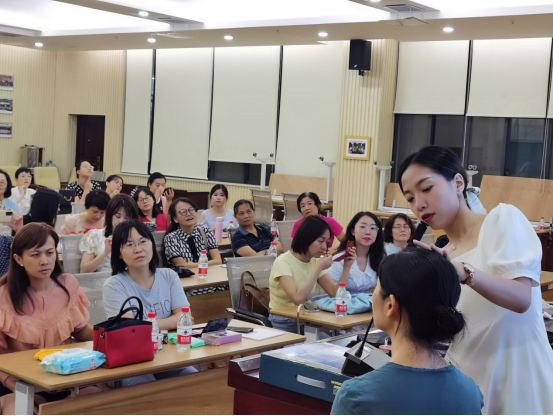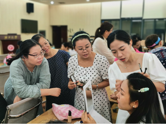 培训分为化妆知识学习、实操练习两个部分进行,老师以日常通勤妆为例讲解了化妆的基础步骤和手法,并请一位老师上台做模特,给大家示范基本手法及技巧。现场妆容互动环节,老师和助理还手把手指导并解答老师们的问题。