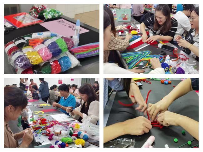 老师们在比赛活动中,利用毛线、扭扭棒、鸡蛋壳、布织布等材料,创作一幅主题为爱党爱国爱附中的拼贴画,提升老师们的动手能力、创新意识,感受毛线创作的魅力,乐享课后生活。
